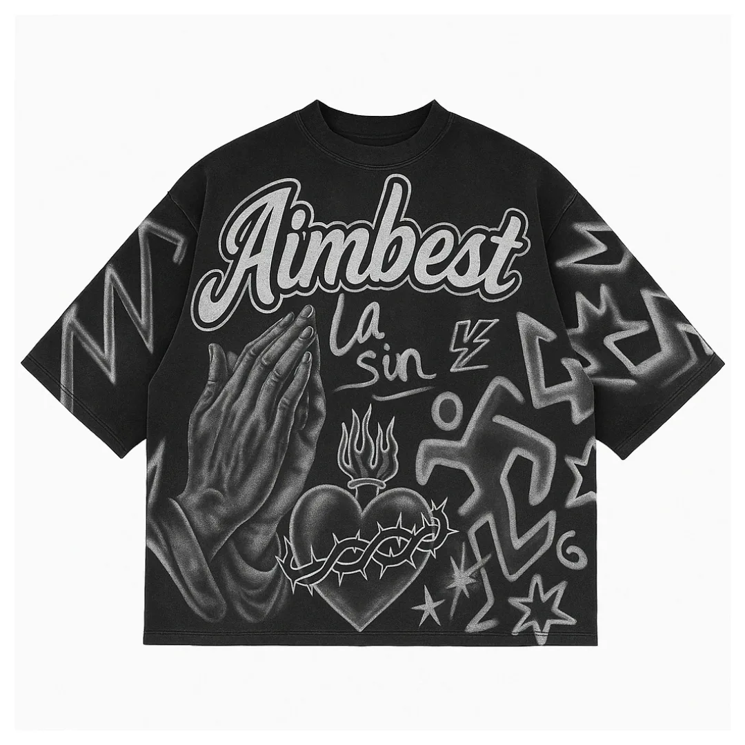 The front design is a stunning airbrushed artwork including the iconic “Aimbest” logo, praying hands, barbed wire heart, and graffiti-inspired motifs like lightning bolts, stars, and figures. Every element reflects a rebellious, raw street vibe fused with artistic detail.