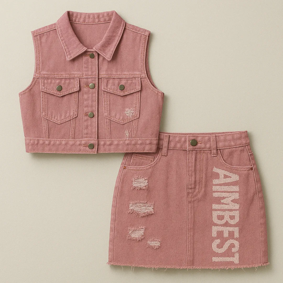 Step into bold retro vibes with this eye-catching 2-piece denim set by AIMBEST, blending classic charm with modern edge. Crafted in a soft vintage pink hue, the set features a sleeveless cropped vest with oversized front pockets, metal buttons, and rugged distressed detailing, including the iconic AIMBEST branding.